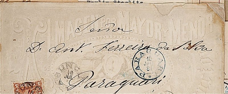 1943 c 12 image#12, 1879-81 5c Orange brown centrally cancelled by small "Asuncion/10 Jul (18)81" double ring c.d.s. on an all-over advertising cover to Paraguari (arrival c.d.s. in blue), flap at back missing and a few small repairs, very fine appearance and very scarce; an attractive and early illustrated cover; ex-Lovibond. (Image) 500.00