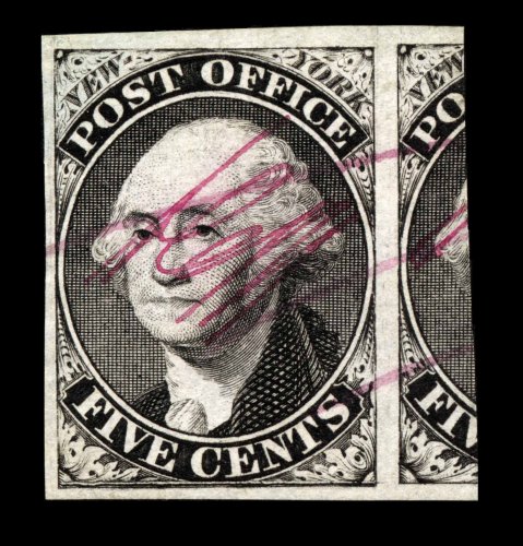 1 O 9X1 image#9X1, New York, N.Y. 5c Black Postmaster Provisional, signed "ACM" connected, position 31, a superb used example showing the distinctive double frameline at bottom variety, large to enormous margins all around, including a substantial portion (about a third) of the adjoining stamp at right, wonderfully fresh and bright, neat and light magenta manuscript cancel (only a tiny percentage of the New York Provisionals - estimated at only 2% according to Jeremiah A. Farrington - were cancelled by magenta pen), an extremely fine gem; 1992 PF certificate; ex-Wall and Farrington. (Image) 575.00