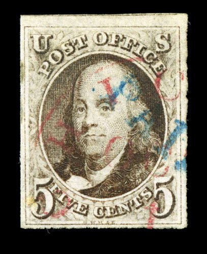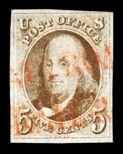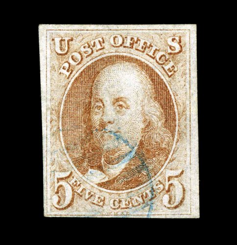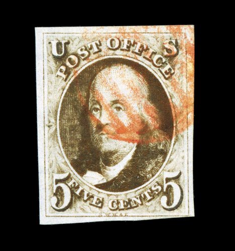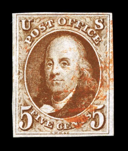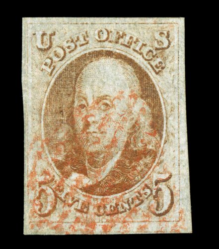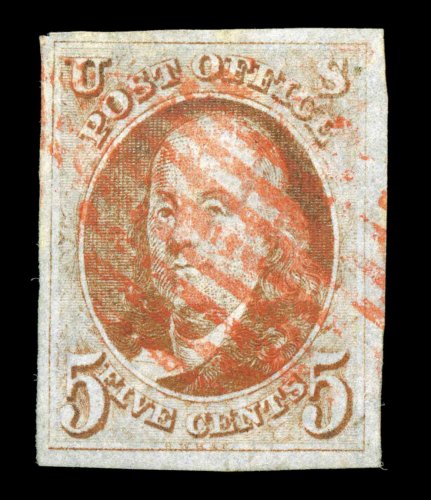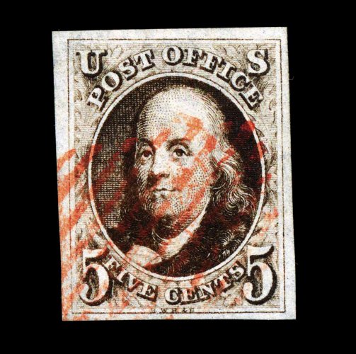 6 O 1 image#1, 5c Red brown, an extraordinarily handsome example featuring the most intense and dark red brown color we have seen (from the first delivery of 1847 issues per Wade Saadi), remarkably detailed early impression, full to large margins all around, light strike of red grid cancel, very fine and choice; 1986 PF certificate. (Image) 600.00