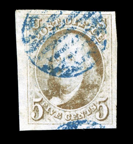 12 O 1a image#1a, 5c Gray brown, an impressive used example, featuring four huge margins, including a partial sheet margin at left, outstanding gray brown shade (from fourth delivery as per Wade Saadi) and a strong impression, especially handsome and contrasting blue circular grid postmarks, extremely fine; a gem example of this scarce and distinctive 1847 color variety. (Image) 685.00
