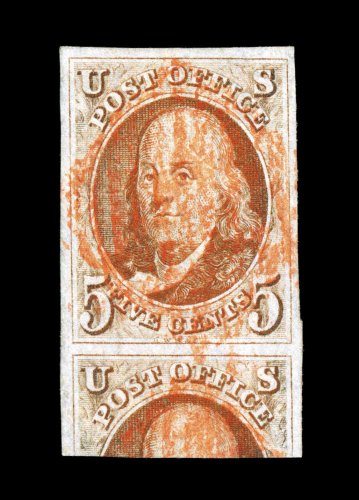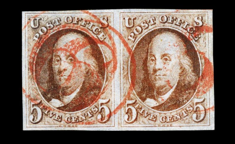 9 O 1 image#1, 5c Red brown, an exceedingly handsome used horizontal pair, featuring four large and well balanced margins, exceptionally fresh color and an excellent clarity of impression on bright fresh paper, wonderfully postmarked with two strikes of a very scarce red numeral "6" in circle cancel, left stamp with just the faintest trace of a light vertical crease, otherwise extremely fine; a wonderful pair for the 1847 Issue specialist. (Image) 1,450.00