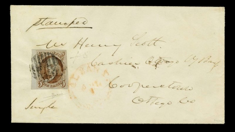 15 c 1b image#1b, 5c Orange brown, select left sheet-margin example tied to lovely clean white cover by both black circular grid and just a bit of red Albany, N.Y. town c.d.s., addressed to Copperstown, N.Y., stamp with sizable sheet margin at left and other margins ample to large, especially deep color and a sharp impression, cover very lightly and professionally cleaned, a very fine and wonderfully choice 1847 cover; accompanied by conflicting certificates regarding its shade identification, February 1997 PF certificate states it is a red brown (which, while deep in color, is clearly not a red brown), July 1997 PSE certificate correctly identifies this as an orange brown and is being sold subject to this certificate. (Image) Est. 750-1,000