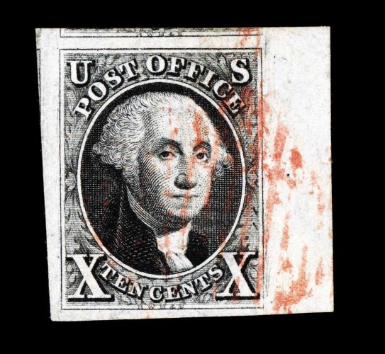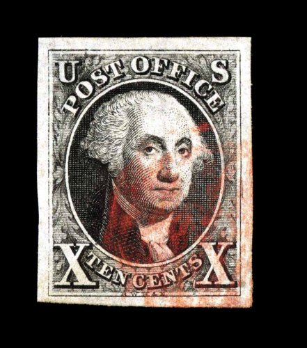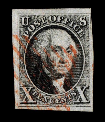 18 O 2 image#2, 10c Black, an incomparable used example with an enormous sheet margin at right measuring 6mm, plus its other margins are huge as well, showing portions of the adjoining stamps at top and at left, absolutely stunning color in a dark shade, with a spectacular clarity of impression on lightly blued paper which shows all of the fine detailed lines of the engraving, wonderfully postmarked with a nicely contrasting and lightly struck red grid cancel, a superb gem; unquestionably one of the finest used Ten Cent 1847 Issues in existence, possessing phenomenal overall physical qualities; 1996 PF certificate. (Image) 1,400.00