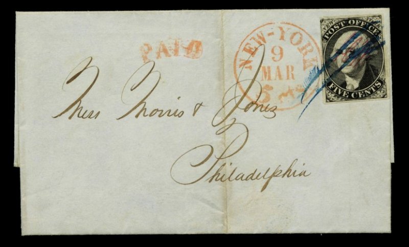 2 c 9X1a image#9X1a, New York, N.Y. 5c Black Postmaster Provisional, signed "AC" connected, position 7, major double transfer at top, an attractive example with four ample to mostly large margins tied to large portion of an 1846 folded entire by two blue pen strokes and a clear "New-York/9 Mar/5 cts." red c.d.s., matching arched "PAID" to left, addressed to Philadelphia, central file fold well away from stamp which is very fine and choice. (Image) 725.00+
