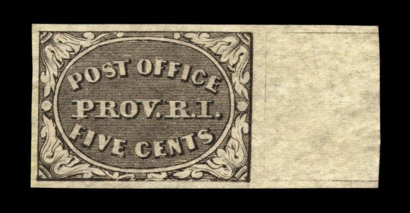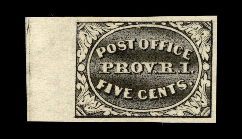 5 ng 10X1 image#10X1, Providence, R.I. 5c Gray black Postmaster Provisional, position 7, a select quality left sheet-margin unused example, with large well balanced margins, unusually intense color, extremely fine; 1997 PF certificate. (Image) 375.00