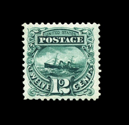182 nh 128 image#128, 12c Green re-issue, the mint example offered here is, without a doubt, one of the most exciting and extraordinary stamps in this or any other sale, as it is in a condition that one would think would be impossible to find, possessing a spectacular overall brilliance and freshness, with incredibly intense color and a razor-sharp impression on bright crisp paper, marvelously well centered amid extravagantly large margins, and most impressive of all is the fact that this exciting stamp's full original gum is never hinged, a feature that is unheard of on this or any other value from the 1869 Pictorial Re-issue series, an extremely fine gem in every regard; the only example of this stamp that the Philatelic Foundation has certified as never hinged; 2001 PF and PSE certificates. (Image) for hinged 2,750.00
