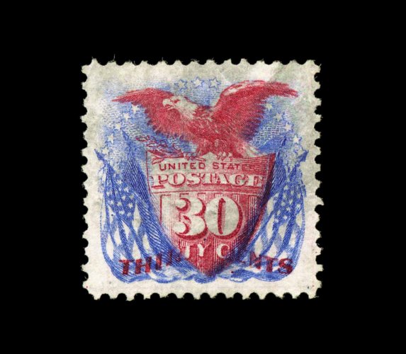 189 O 131 image#131, 30c Blue and carmine re-issue, a superb used example of this rare and popular re-issue, being in a condition that places it among the finest known used examples, flawlessly centered amid incredibly large margins all around, gorgeous intense colors and impressions on wonderfully bright paper, far more lightly cancelled than any other used copy we have seen, as these are typically found with boldly struck double oval registry postmarks, an extremely fine used gem for the finest collection; only 1,535 issued; 1984 and 1989 PF certificates; ex-Saadi. (Image) 2,500.00