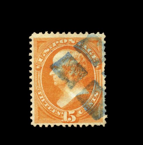 197 O 141 image#141, 15c Orange with grill, used, wonderfully well centered within very large margins for the issue, gorgeous intense and vibrant color on fresh paper, beautifully contrasting quartered cork postmark in deep blue, easily identifiable grill points, extremely fine; 2001 PF certificate. (Image) 1,220.00