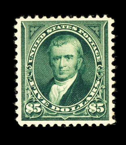 291 O 263 image#263, $5.00 Dark green, an extraordinary quality used example of one of the rarest regularly issued stamps in U.S. philately, being in a condition unlike any other used example we have ever seen, let alone have offered in our auctions, incredibly fresh, with sumptuously rich color and a deeply etched impression on bright paper, marvelously centered as well, with uncharacteristically large margins, only faintly cancelled in red at bottom right, essentially leaving the entire design cancel free, extremely fine; the rarity of this stamp used in such gem condition cannot be overemphasized, as the great majority of used #263's are found either with faults, heavily cancelled, or both; quite likely the finest and most lightly cancelled Five Dollar 1894 Unwatermarked Bureau issue in existence; 1999 PF certificate. (Image) 2,250.00