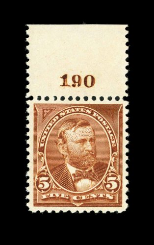 290 og 263 image#263, $5.00 Dark green, a spectacular quality mint example of this truly rare high value, being in a condition that is likely to be rivaled by few other existing copies, possessing outstanding centering amid extraordinarily large margins that are most uncharacteristic of this, additionally this stamp possesses stunningly intense color and a deeply etched impression on brilliantly fresh paper, full clean o.g. that shows just the barest suggestion of hinging (some experts who have seen this stamp suggest that it may be never hinged, although the accompanying certificate states "previously hinged"), an extremely fine gem in every regard; this stamp, which is the most difficult value of the 1894 Bureau issue series to find in premium condition, is the finest #263 we have ever encountered; 1989 and 1999 PF certificates. (Image) 4,500.00