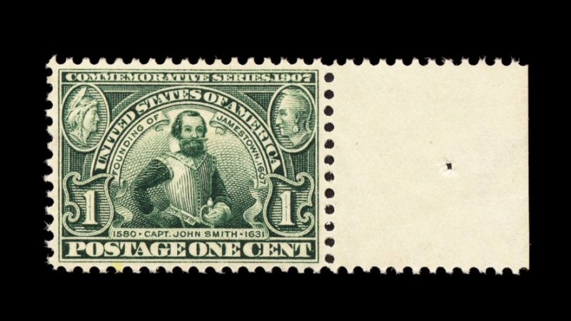 365 nh 328 image#328, 1c Jamestown, choice right sheet-margin mint single, exceedingly well centered for this always difficult series, brilliantly fresh, o.g., n.h., extremely fine; 1990 PF certificate; ex-Lyons. (Image) 55.00