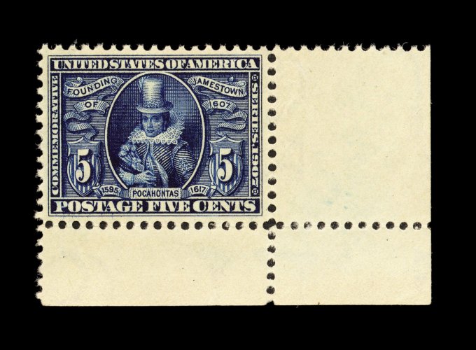 368 nh 330 image#330, 5c Jamestown, the bottom right corner sheet-margin single offered here is one of the finest examples of this notoriously difficult commemorative we have offered in some time, as it possesses several physical attributes which are rarely found on this value, including being extraordinarily well centered amid much larger margins than usual, plus its color is incredibly intense and its impression deeply etched on brilliantly white paper, o.g., n.h., extremely fine; actually a very rare and desirable stamp in this gem condition; ex-Parker. (Image) 250.00