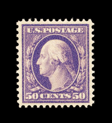 374 nh 341 image#341, 50c Violet, a brilliant "post office" fresh mint example, possessing gloriously rich color and a crisp detailed impression on bright paper, marvelously well centered within large margins, unblemished o.g., n.h., extremely fine; a truly challenging stamp to find both this choice and never hinged; 2001 PF certificate for a block of four, this being the bottom left stamp. (Image) 625.00