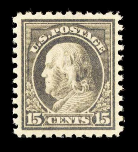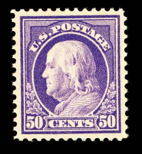 453 nh 440 image#440, 50c Violet, an incredibly choice mint example of a stamp that is almost never found in this true gem condition, being incredibly well centered within large margins, plus its color is especially deep and luxuriant on crisp paper, immaculate o.g. without a single gum bend or skip, n.h., extremely fine; certified never hinged examples of the 1915 Fifty Cent Perf. 10 Franklin are few and far between; 2001 PF certificate. (Image) 1,050.00