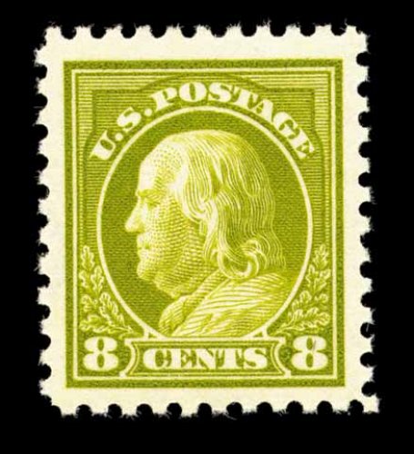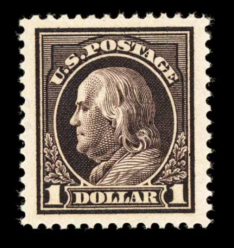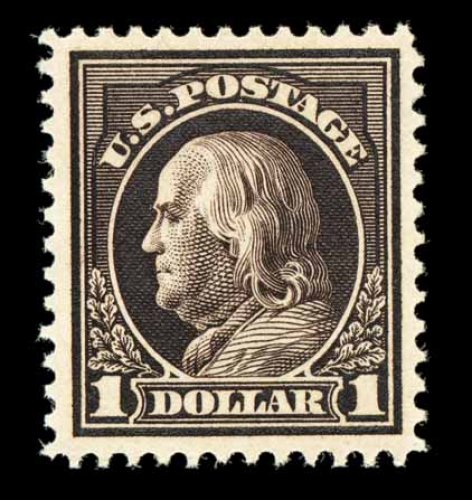 443 nh 423 image#423, $1.00 Violet brown, a brilliant mint single in a true "post office" fresh state, possessing incredibly intense color and a well incised impression on immaculate paper, wonderfully well centered within large margins, pristine o.g., n.h., extremely fine; a gem never hinged 1912 One Dollar Franklin; 2001 PF certificate. (Image) 950.00
