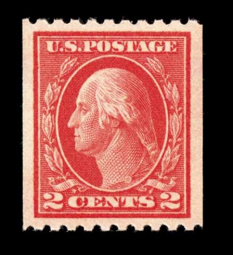 455 nh 442 image#442, 2c Carmine flat plate coil, perf. 10 horiz., a "perfect" mint single, flawlessly centered amid huge margins, radiant color, immaculate o.g., n.h., superb; an impressive coil single; 2001 PF certificate for a strip of six from which this stamp was taken. (Image) 18.00
