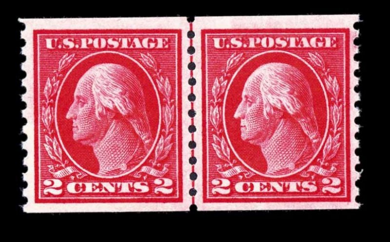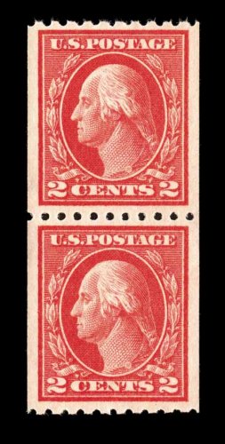 458 nh 444 image#444, 2c Carmine flat plate coil, perf. 10 vert., guide line pair, an exceptional quality example of this very scarce and difficult line pair, possessing an overall freshness and brilliance not often seen, gorgeous intense color with a richly inked impression, marvelously well centered and margined, pristine o.g., n.h., extremely fine; 1999 PF certificate for a line strip of four from which this pair was taken. (Image) 525.00
