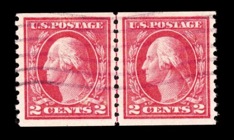 459 O 444 image#444, 2c Carmine flat plate coil, perf. 10 vert., a used guide line pair in a quality unlike any other we have ever seen, incredibly well centered amid lavishly large margins, lovely bright color and a strong impression on immaculate paper, beautifully postmarked with a light and neat wavy line machine postmark, extremely fine; the ridiculously low catalog value in Scott bears no relationship to true value of this remarkable used line pair; 2001 PF certificate. (Image) 27.50
