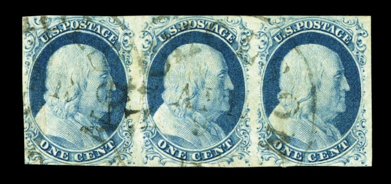41 O 9 image#9, 1c Blue, Ty. IV, horizontal strip of three, positions 41-43R1L, with position 41R1l showing an intermediate state of a plate crack across portrait, rich color and clean impressions on bright paper, light town c.d.s., left stamp with tight even margins, right pair exceptionally well margined, overall very fine. (Image) 425.00+