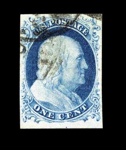 42 O 9 image#9, 1c Blue, Ty. IV, recut once at top, position 94R1L, used, extravagantly large and wonderfully well balanced margins all around, including a partial sheet margin at bottom, bright fresh color and an excellent impression, light mostly face-free town c.d.s. at top left, extremely fine; a gem example which possesses great eye appeal; 2000 PF certificate. (Image) 130.00