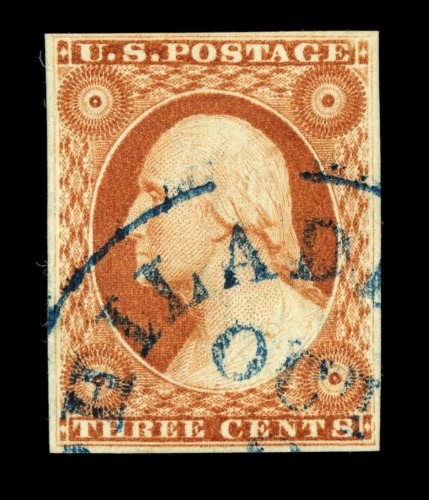 43 O 10, 11 #10, 11, 1851-57 Three Cent color study chart assembled by Dr. W.F. Amonette, a total of 76 used stamps arranged by shades as appearing by year, consisting of eight shades of #10, including the yellowish orange brown and bright orange brown (both rarity 9 on Dr. Amonette's scale of 1 to 10), there are two shades of the scarce experimental orange brown (rarity 5) and a four margin reddish orange brown (rarity 8), plus there are 66 shades of #11, including the late 1852 Claret (rarity 7; catalog value $2,000.00) but with a bold pen cancel, most are three margin examples as is usual for a color study, but some four margin copies noted, few small faults, range of cancels (few with manuscript), overall a fine and important assemblage for the Three Cent student (not illustrated). Est. 500-750