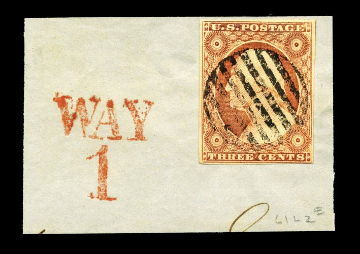 45 O 10 image#10, 3c Orange brown, position 61L2E, two line recut in upper left triangle, full margins, deep rich color, used on piece with central black grid, and with choice strike of red WAY 1 handstamp of New Orleans to left, very fine and handsome; 1987 PF certificate; ex-Koppersmith. (Image) 265.00