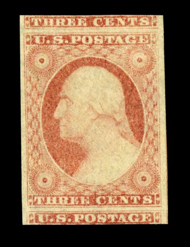54 og 15 image#15, 10c Green, Ty. III, a phenomenal quality mint example of this rare classic, being in a truly remarkable state of preservation for a stamp of this vintage, possessing a sensational overall freshness and crispness, with gorgeous bright color and a deeply etched impression on immaculate paper, enormously large and wonderfully well balanced margins all around, its reverse is equally impressive, featuring full pristine o.g. that has been only very lightly hinged, extremely fine gem; a superb original gum example of the 1855 Ten Cent Type III imperforate stamp; one of the great condition rarities in this year's Premier Sale; 2001 PF certificate. (Image) 4,000.00