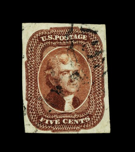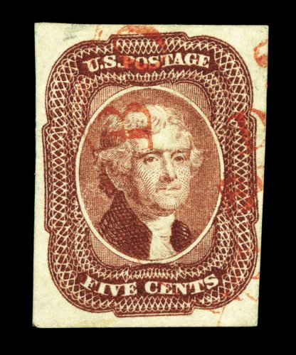 48 O 12 image#12, 5c Red brown, an exceptionally handsome used example, featuring four large to very large margins, deep luxuriant color and impression on bright paper, wonderfully postmarked with a seldom seen red town c.d.s., miniscule corner crease at top left of little importance and not mentioned on accompanying certificate, otherwise extremely fine; clear 1967 PF certificate. (Image) 1,250.00