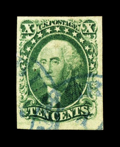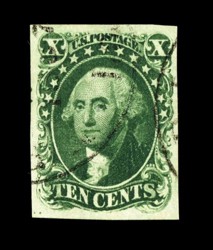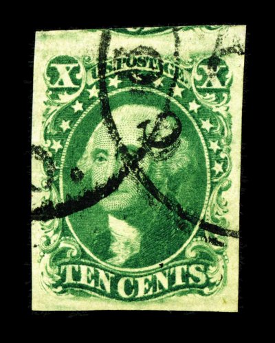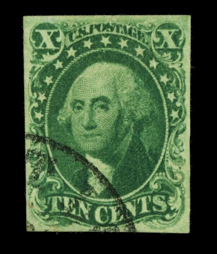 49 O 13 image#13, 10c Green, Ty. I, an exceedingly handsome and choice used example, featuring four very large and perfectly balanced margins, plus this stamp's color is extraordinarily intense and its impression deeply etched, all on bright white paper, very light and unobtrusive town c.d.s., extremely fine; seldom encountered in this gem quality; 2001 PF certificate. (Image) 800.00