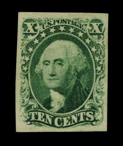 51 og 14 image#14, 10c Green, Ty. II, an exceptional mint example of this classic imperforate, featuring four large and uniformly balanced margins, deep rich color and a strong impression, full clean o.g. that has been only lightly hinged, accompanying certificate mentions the presence of a small stained spot at top right which, in our opinion, is almost non-existent and limited to the extreme edge of the stamp (could readily be trimmed away), extremely fine and exceedingly choice; 1989 PF certificate. (Image) 4,000.00
