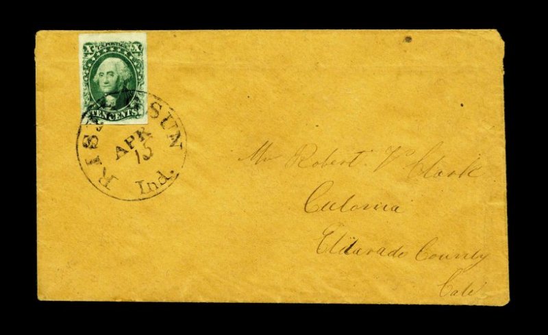 53 c 14 image#14, 10c Green, Ty. II, lavishly margined single, with partial sheet margin at top, prooflike color and impression, superbly tied to neat buff cover by scarce "Rising Sun, Ind./Apr 15" c.d.s. (date numeral added in ms.), addressed to Eldarado (sic) County, California, cover with very mild horizontal fold at top just affecting stamp (accompanying certificate states "light horizontal crease" on stamp, however nothing more than a bend), otherwise extremely fine; a most attractive cover; 1982 PF certificate. (Image) 290.00