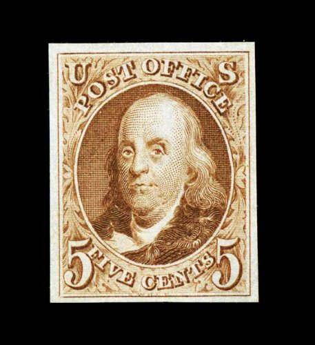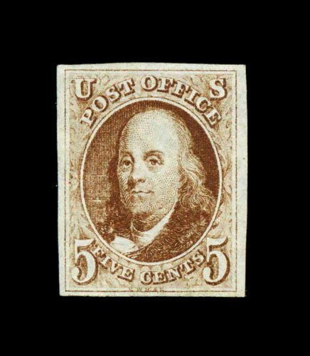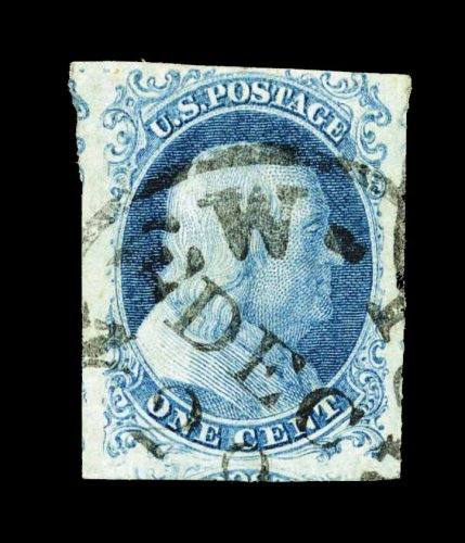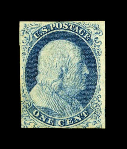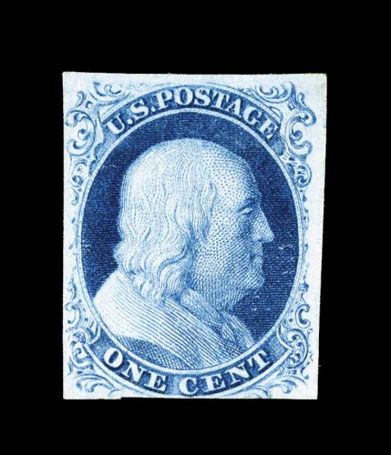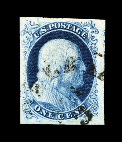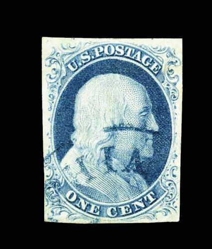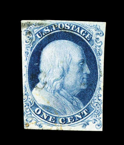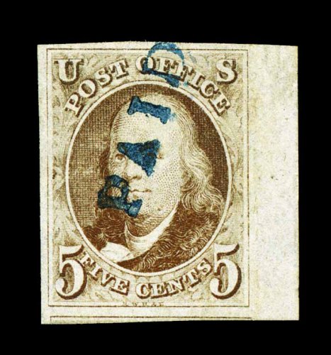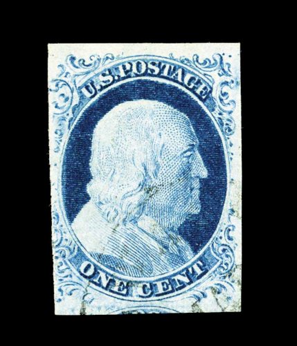 8 O 5 image#5, 1c Blue, Ty. I, position 7R1E, exceptionally well margined, with uniformly large margins on three sides, fourth margin at bottom just touching extreme lower portions of plumes and scrolls, sumptuously rich color and a highly detailed impression on bright fresh paper, beautifully postmarked with an unobtrusive circular grid in deep blue, plus there is a portion of a black cancel at top which is likely to be part of a French decimes handstamp, few small thin spots which have been expertly filled, otherwise very fine. An especially handsome appearing example of one of the rarest and most sought-after classic United States stamps. One position, the legendary position 7R1E, provides the philatelic world with the only full Type I design as originally intended, a characteristic no other One Cent imperforate displays. Less than 100 examples of this rarity exist, virtually all of which are used. Very few are found with the overall eye-appealing qualities that this stamp possesses - wide margins allowing for easy identification of the Ty. I characteristics, strong rich color, excellent clarity of impression and neatly cancelled so that no portion of the postmarks obscure the important design factors. A large number of the recorded examples of Scott #5 have faults ranging from rather minor to severe. The thin spots on this stamp are quite small and none affect its overall exceptional appearance. These trivial thins have been so expertly filled that they have, in fact, been overlooked in most past auction descriptions. Accompanied by a 1988 PF certificate. (Image) 45,500.00