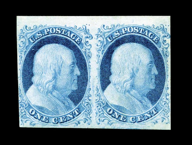 9 ng 5A image#5A, 1c Blue, Ty. Ib, positions 4-5R1E, an enormously rare unused horizontal pair, regummed, featuring very large margins both at top (partial sheet margin) and at bottom, left margin just cutting, while margin at right is close but clear, brilliantly fresh and vibrant color, outstanding impressions showing the Ty. Ib design characteristics exceedingly well, left stamp with tiny thin spot, right stamp with spot at top, a corner crease at top right (in sheet margin only) and an internal horizontal crease/wrinkle at right, none of which affect this pair's very fine and appealing appearance; an important One Cent Blue imperforate multiple, as very few Ty. Ib multiples exist unused in any condition; 1999 PSE certificate. (Image) 30,000.00