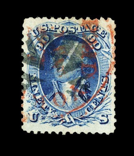 195 O 101 image#101, 90c Blue, "F" grill, an exceptionally handsome used example, being quite well centered within unusually large margins, rich luxuriant color, wonderfully postmarked by both a black circle of "V's" and a striking red New York Paid c.d.s., very fine; used examples of this high value are seldom encountered this choice, particularly with a desirable colored cancellation; 1988 PF certificate; ex-Koppersmith. (Image) 1,500.00