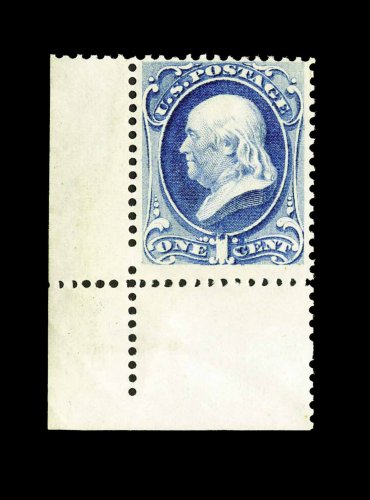 295 nh 156 image#156, 1c Ultramarine, an impressive "post office" fresh bottom left corner sheet-margin single, with intense prooflike color and impression on uncommonly bright paper, centered a bit to top, o.g., never hinged, nearly very fine; quite scarce never hinged; 1997 PF certificate for a horizontal pair, this being the left stamp. (Image) for hinged 225.00