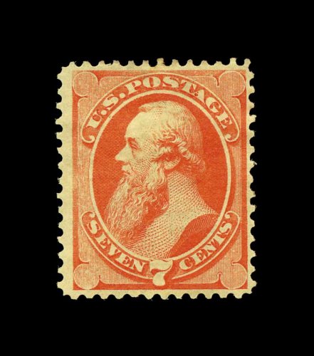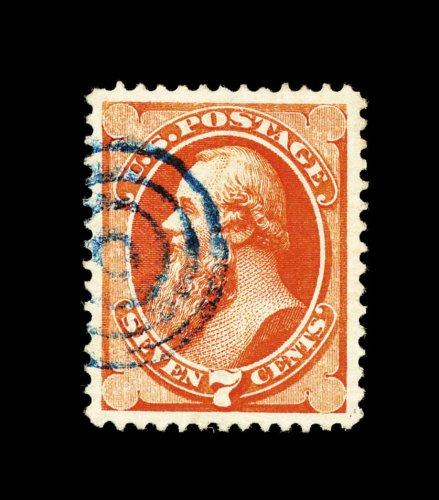 299 O 160 image#160, 7c Vermilion, a truly superb used example, possessing extremely large and perfectly balanced margins all around, eye-arresting color in an incredibly vibrant shade, strong impression as well on bright paper, beautifully cancelled by a contrasting deep blue target postmark, extremely fine gem; a stamp for the perfectionist; 1991 PF certificate. (Image) 84.00