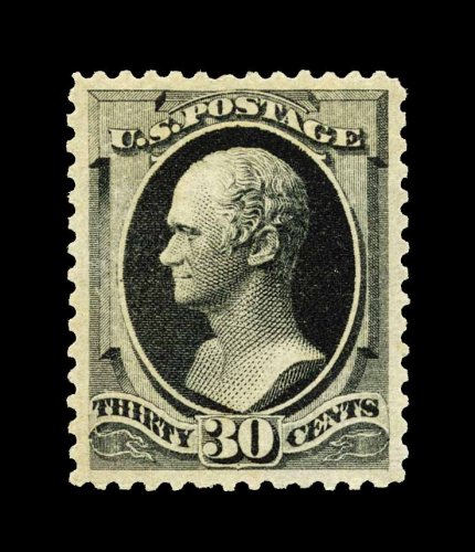 329 og 190 image#190, 30c Full black, a magnificent quality mint example of this difficult stamp, being in a condition rivaled by few others, featuring immense and perfectly balanced margins all around, incredibly intense color and an impression far stronger than usual, full clean o.g. that has only a single light hinge mark, an extremely fine gem in every regard; certainly one of the finest known examples of this rare mint stamp; 1993 PF certificate; ex-Morris. (Image) 1,100.00