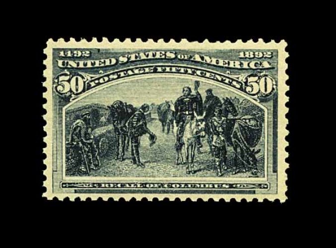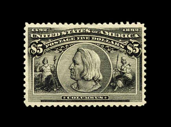 392 og 245 image#245, $5.00 Columbian, an exceptionally handsome and choice mint example of this popular high value commemorative, possessing both outstanding centering and uncharacteristically large margins, additionally this stamp's color and impression are truly prooflike on bright paper, full o.g., lightly hinged, extremely fine; 1991 PF certificate. (Image) 3,500.00