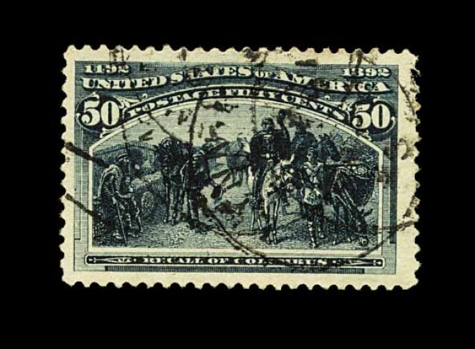 382 O 240 image#240, 50c Columbian, impressively wide used example, featuring huge margins all around and being quite well centered within them, deep rich color, couple of light strikes of town c.d.s., extremely fine. (Image) 160.00