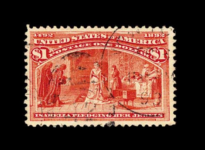 384 O 241 image#241, $1.00 Columbian, highly select used example, wonderfully well centered amid uncharacteristically large margins, sumptuously rich color and a sharp impression, very light town c.d.s. dated 1893 and a duplex numeral grid (far more desirable than the typical registry oval postmark), extremely fine; the One Dollar Columbian is perhaps the most challenging of all the dollar value Columbians to find in this premium used condition; 1992 PF certificate. (Image) 650.00