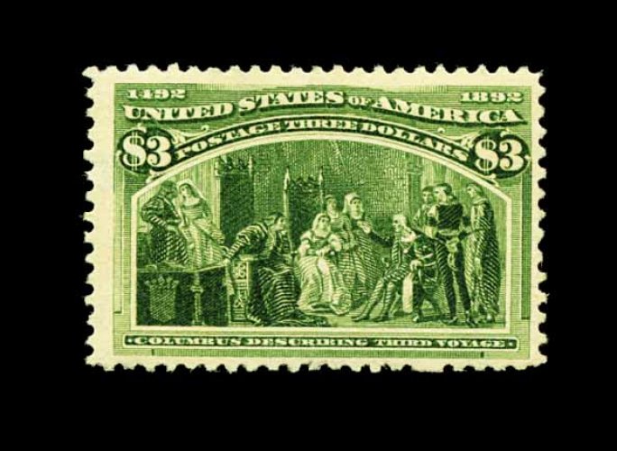 388 og 243a image#243a, $3.00 Columbian, the olive green shade, deep luxuriant color on fresh paper, nicely centered, full o.g. which is a bit disturbed, very fine; 1997 PF certificate. (Image) 2,250.00