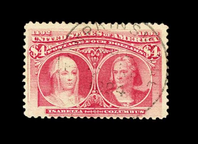 390 O 244 image#244, $4.00 Columbian, used, light central strike of an 1894 town c.d.s., color slightly faded, fine; 2001 PF certificate. (Image) 1,350.00