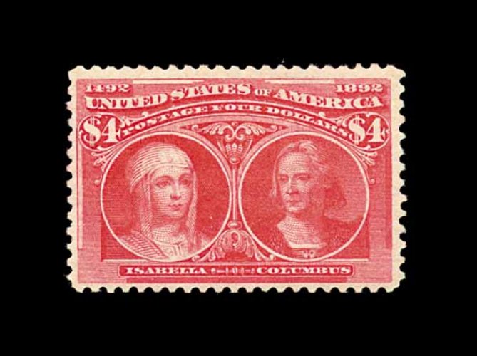 391 og 244a image#244a, $4.00 Columbian, the rose carmine shade, a wonderfully fresh and bright mint example, featuring gorgeous rich color and impression on immaculate paper, well centered, full clean o.g., lightly hinged, very fine; a choice original gum Four Dollar Columbian; 1981 PF certificate. (Image) 3,000.00