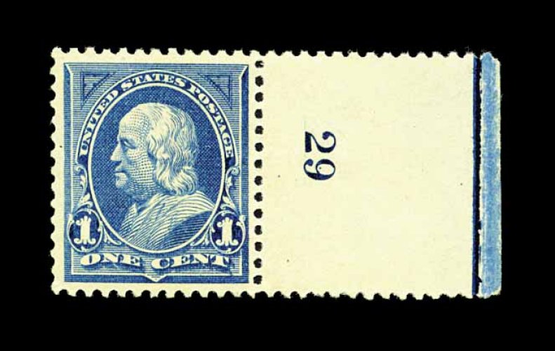 394 nh 247 image#247, 1c Blue, right sheet-margin plate no. 29 single, wonderfully fresh and bright, well centered, o.g., n.h., extremely fine; 1993 PF certificate for a strip of three, this being the bottom stamp. (Image) 135.00