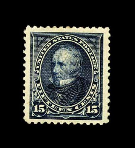 400 og 259 image#259, 15c Dark blue, impressively margined mint single, being exceptionally well centered within huge margins, deep luxuriant color and impression on bright paper, o.g., lightly hinged, extremely fine and striking. (Image) 300.00