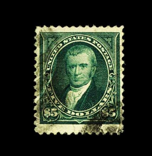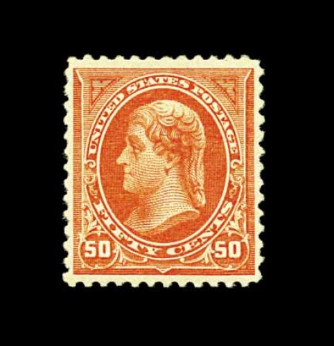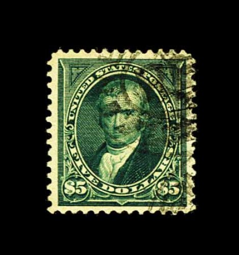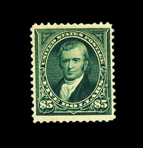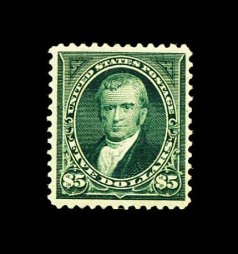408 og 263 image#263, $5.00 Dark green, a choice quality mint example of this popular and difficult high value, being exceptionally well centered within large margins, especially deep and luxuriant color, crisp detailed impression, o.g., with just the barest suggestion of a hinge mark, extremely fine; a very rare mint stamp in any condition, as only 25,000 were issued, but only a tiny fraction of this number still exist in this premium condition; 1978 PF certificate. (Image) 4,500.00