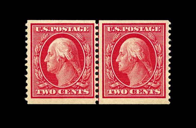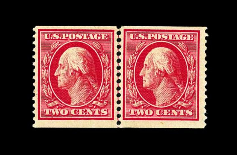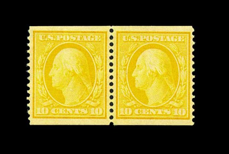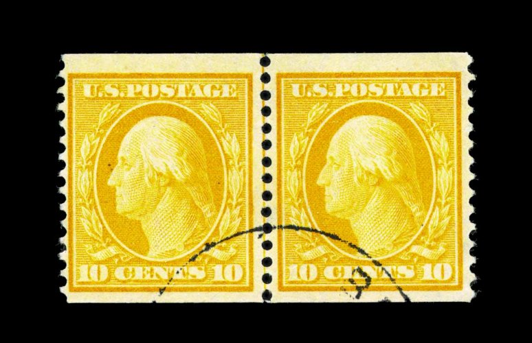488 O 356 image#356, 10c Yellow coil, perf. 12 vert., a most extraordinary used guide line pair, being the only recorded used line pair of the Ten Cent 1909 Coil, fabulously fresh, with absolutely radiant color and an unusually strong impression on bright paper, marvelously well centered, neat and unobtrusive portion of a town c.d.s. at bottom, very fine and exceedingly choice; a mint line pair of Scott #356 is one of the great rarities of the 20th century, but a used line pair holds an historic place in U.S. philately, as this and the used line strip of four of Scott #388, are the only two Washington-Franklin coils that are unique in used condition; this exciting item has not been on the auction market in well over a decade, hence its listed but unpriced status in the Scott catalog; we have based our estimate on the realization of the unique used line strip of four of Scott #388 which sold in April 2001 as part of the Thurston Twigg-Smith collection (Robert A. Siegel Auction Galleries, Inc.), having realized $23,100.00 (including premium) after fierce competitive bidding; 1970 PF certificate. (Image) Est. 15,000-20,000