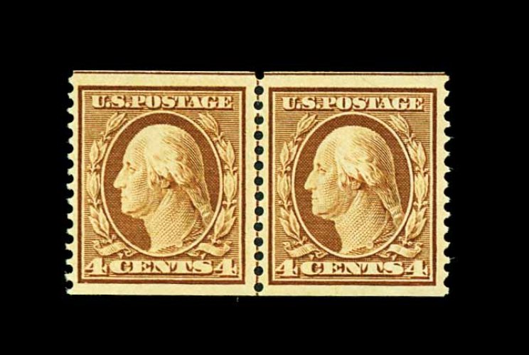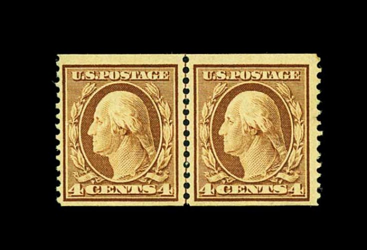 483 og 354 image#354, 4c Orange brown coil, perf. 12 vert., guide line pair, an exceptionally handsome example, wonderfully well centered amid uncharacteristically large margins, rich luxuriant color and impression, pristine o.g., lightly hinged, extremely fine for this rare line pair; 2000 PF certificate. (Image) 1,500.00
