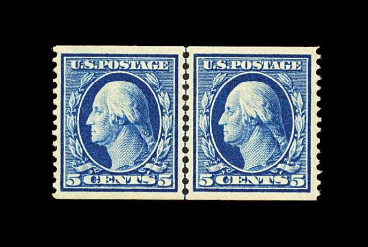 485 nh 355 image#355, 5c Blue coil, perf. 12 vert., guide line pair, magnificently fresh and choice, gloriously rich color and a razor-sharp impression, incredibly well centered and margined, pristine o.g., n.h., extremely fine; a rare line pair in perhaps the finest attainable quality; 1984 PF certificate. (Image) 2,700.00