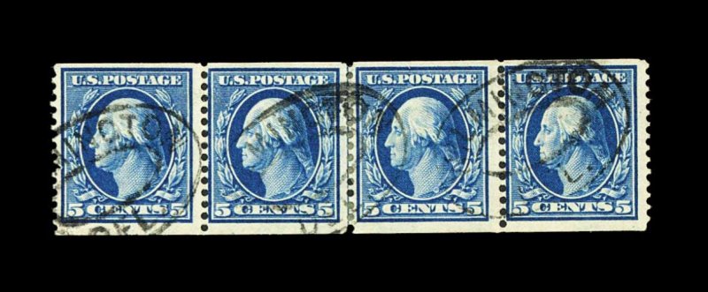 486 O 355 image#355, 5c Blue coil, perf. 12 vert., an enormously rare used guide line strip of four, being the first such example we have ever seen, attractively centered, rich color, three strikes of a Wilmington, De. double oval cancel, left stamp with small nick at edge, some separated vertical perforations in the line pair hinge reinforced, fine-very fine; 1988 PF certificate. (Image) 1,190.00+